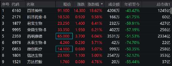 醫(yī)藥股爆發(fā),百濟神州漲19%,科濟藥業(yè)漲近10%,君實生物、榮昌生物、藥明康德(603259)漲超6%,永泰生物、微創(chuàng)醫(yī)療等漲超5%。
