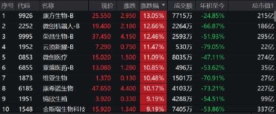 港股醫(yī)藥股持續(xù)走高,康方生物漲13%,微創(chuàng)機(jī)器人(300024)、榮昌生物漲超12%,云頂新耀、微創(chuàng)醫(yī)療漲超11%,亞盛醫(yī)藥、康希諾生物漲超10%,藥明康德(603259)漲超9%。