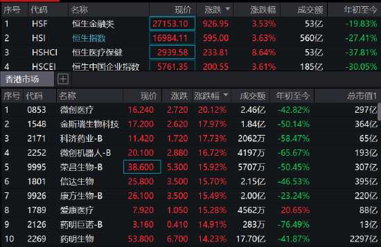 港股恒指午后漲幅擴(kuò)大至3.63%,逼近17000點(diǎn),恒生醫(yī)療保健指數(shù)暴漲8.6%,微創(chuàng)醫(yī)療漲超20%,金斯瑞生物科技、科濟(jì)藥業(yè)漲18%,微創(chuàng)機(jī)器人(300024)漲近17%,信達(dá)生物、榮昌生物漲近16%,愛康醫(yī)療、康方生物等漲超15%,藥明生物、藥明巨諾等漲近14%,藥明康德(603259)漲12%。
