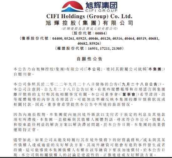 旭輝永升生活一度暴漲逾30%,目前漲24%,旭輝控股集團(tuán)漲12%,旭輝控股10月13日發(fā)布公告稱,有關(guān)媒體報導(dǎo)的內(nèi)容及市場謠言,可能無法準(zhǔn)確反映集團(tuán)的離岸債務(wù)狀況或相關(guān)付款。集團(tuán)一直積極與其債權(quán)人團(tuán)體對話,尋求符合公司、債權(quán)人和股東最佳利益的解決方案以解決滯延問題。集團(tuán)的商業(yè)營運(yùn)維持正常。
