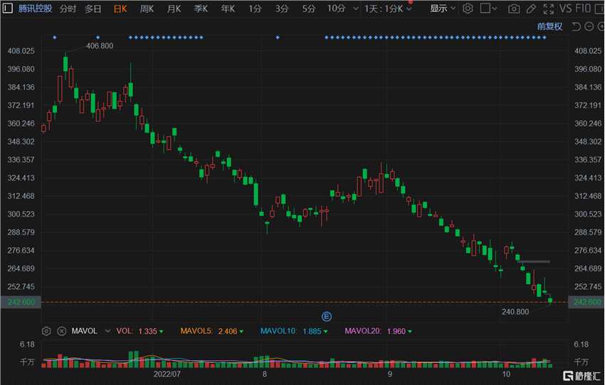 騰訊跌近3%向下逼近240港元關(guān)口,創(chuàng)2017年5月以來新低。騰訊近日加大回購力度,已連續(xù)3日單日回購超6億港元。自2022年8月19日以來,騰訊已連續(xù)39個(gè)交易日回購,共計(jì)5002萬股,耗資144.72億港元。騰訊年內(nèi)累計(jì)回購次數(shù)已達(dá)76次,回購金額為244.85億港元。 另外還值得注意的是,知名投資者段永平在10月13日上午稱他再度出手以32.05美元買入10萬股騰訊ADR,耗資約2500萬港元。這是段永平年內(nèi)第五次出手加倉騰訊。