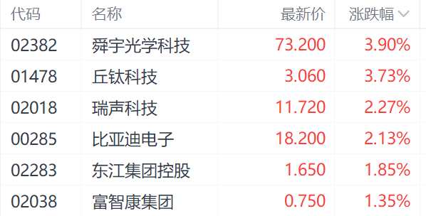蘋(píng)果概念股中,舜宇光學(xué)科技(02382.HK)、丘鈦科技(01478.HK)、瑞聲科技(02018.HK)分別上漲3.90%、3.73%、2.27%。