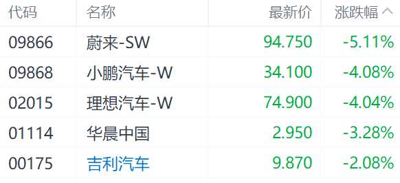 汽車(chē)股中,蔚來(lái)-SW(09866.HK)、理想汽車(chē)-W(02015.HK)、小鵬汽車(chē)-W(09868.HK)分別下跌5.11%、4.04%、4.08%。