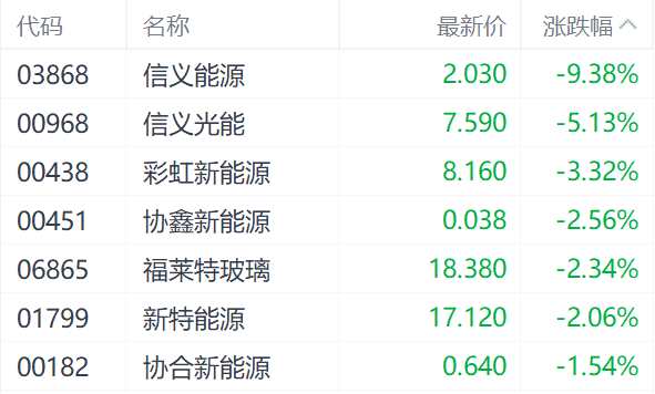 光伏概念股中,信義能源(03686.HK)、信義光能(00968.HK)、協(xié)鑫新能源(00451.HK) 分別下跌9.38%、5.13%、2.56%。