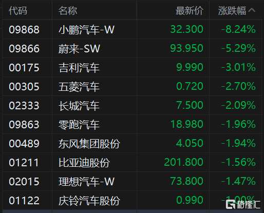 汽車股再度走低,小鵬汽車跌超8%。小鵬汽車跌8.24%領(lǐng)跌,蔚來跌超5%,長城汽車、吉利汽車、理想汽車跟跌。