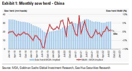 高盛發(fā)研報指,認(rèn)為生豬價格已經(jīng)見頂:國內(nèi)生豬價格環(huán)比上漲18%至27.7元/公斤,主要受飼料成本上漲和超大型育肥豬的推動。具體而言,玉米和大豆價格自9月以來上漲7-9%,轉(zhuǎn)化為生豬生產(chǎn)成本上漲1.0元/公斤。該行估計(jì),市場生豬育肥過程的延長使當(dāng)前市場供應(yīng)減少約5%。此外,根據(jù)部分生產(chǎn)商的反饋,生豬(15-20%)和母豬飼料(10-20%)銷售的強(qiáng)勁連續(xù)反彈,意味著2023年上半年的供應(yīng)將進(jìn)一步增長。該行認(rèn)為當(dāng)前生豬價格不可持續(xù),維持2023年20元/公斤的價格預(yù)測或周期中期預(yù)測。