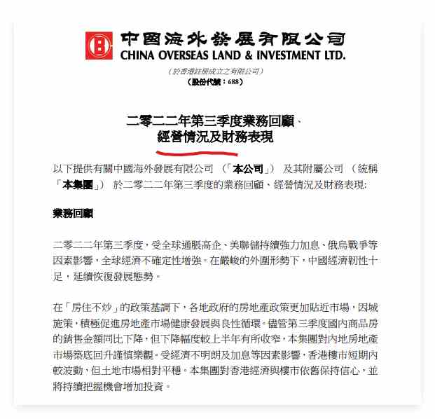 另,2022年第三季度,集團(tuán)在中國(guó)內(nèi)地7個(gè)城市新增10幅土地,新增總樓面面積195萬平方米(權(quán)益面積182萬平方米),總地價(jià)人民幣322.0億元(權(quán)益地價(jià)為人民幣288.5億元)。集團(tuán)的收入為人民幣175.2億元,扣除投資物業(yè)公允價(jià)值變動(dòng)收益和匯兌凈損益后的經(jīng)營(yíng)溢利為人民幣18.0億元。