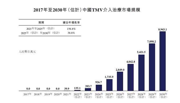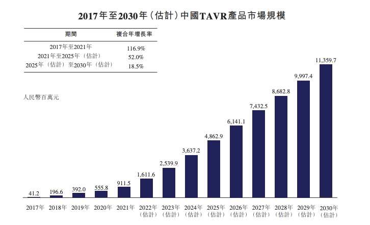 據(jù)弗若斯特沙利文的資料,中國TAVR手術(shù)量于2021年達6600宗,預(yù)計將在2025年及2030年分別達4.3萬宗及10.95萬宗,預(yù)計2021-2025年復(fù)合增長率59.6%,2025-2030年復(fù)合增長率預(yù)計將達20.5%。相關(guān)產(chǎn)品市場規(guī)模2021年達9.12億元,預(yù)計2025年將達48.63億元,2023年進一步增至113.6億元。