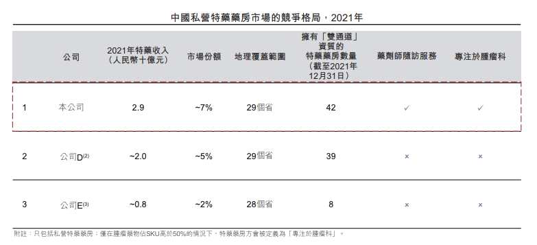 截至2021年,按收入計(jì),腫瘤特藥占中國(guó)所有特藥類別約63.5%,當(dāng)年十大暢銷特藥中,有八種為腫瘤藥。而思派健康按特藥收入計(jì),為國(guó)內(nèi)最大的私營(yíng)特藥藥房,收入規(guī)模約29億元,市場(chǎng)份額達(dá)7%。截至2022年6月,公司在國(guó)內(nèi)經(jīng)營(yíng)103家特藥藥房,其中76家為社會(huì)醫(yī)療保險(xiǎn)的指定藥房,占比74%。
