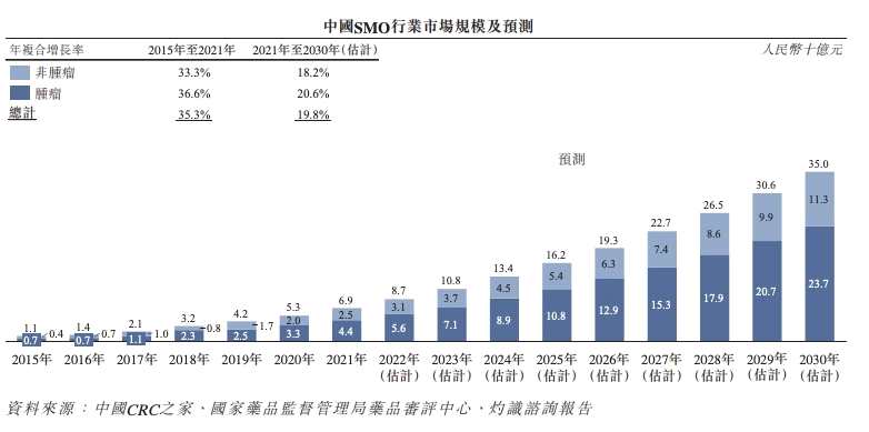 此外,公司的SMO(臨床實(shí)驗(yàn)專業(yè)服務(wù)組織)業(yè)務(wù)貢獻(xiàn)了醫(yī)生研究協(xié)助業(yè)務(wù)大部分收入。根據(jù)灼識(shí)咨詢的資料中國(guó)SMO服務(wù)市場(chǎng)由2015年的11億元增加至2021年的69億元,年復(fù)合增長(zhǎng)率為35.3%,預(yù)計(jì)2025年將進(jìn)一步達(dá)到162億元,2021-2025年的年復(fù)合增長(zhǎng)率將為23.8%,2030年達(dá)到人民幣350億元,2025-2030年的年復(fù)合增長(zhǎng)率將為16.7%。同時(shí),預(yù)計(jì)2021-2030年腫瘤SMO市場(chǎng)將占SMO市場(chǎng)的約63.7%至67.8%。