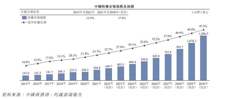 根據(jù)灼識(shí)咨詢的資料,特藥指高價(jià)值的處方藥,通常針對(duì)癌癥等重大疾病。近年來(lái),中國(guó)特藥市場(chǎng)穩(wěn)步增長(zhǎng),市場(chǎng)規(guī)模由2015年的1470億元增加至2021年的3048億元,年復(fù)合增長(zhǎng)率為12.9%。預(yù)期2025年將進(jìn)一步達(dá)到人民幣5488億元,2021-2025年的年復(fù)合增長(zhǎng)率為15.8%。2030年或達(dá)12865億元,2025-2030年的年復(fù)合增長(zhǎng)率為18.6%。