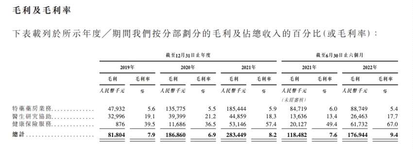 財(cái)務(wù)數(shù)據(jù)顯示,思派健康于2019-2021年及2022年上半年的營(yíng)收分別為10.39億元、27億元、34.74億元及18.88億元。同期凈虧損分別為5.96億元、10.42億元、37.49億元及3.46億元。值得注意的是,截至2022年上半年,思派健康與59家保險(xiǎn)公司合作的健康保險(xiǎn)服務(wù),收入占比不足5%,但卻貢獻(xiàn)了同期約35%的毛利,67%的毛利率遠(yuǎn)遠(yuǎn)高于特藥藥方業(yè)務(wù)及醫(yī)生研究協(xié)助業(yè)務(wù)。公司還提示稱,特藥市場(chǎng)的競(jìng)爭(zhēng)激烈,需要面對(duì)供應(yīng)商、市場(chǎng)需求變化、政策等多方面的風(fēng)險(xiǎn)。