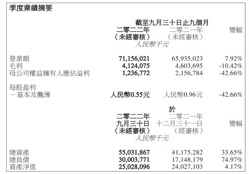 比亞迪電子績(jī)后股價(jià)大漲9%,比亞迪(002594)電子發(fā)布了截至2022年9月30日止9個(gè)月未經(jīng)審核的業(yè)績(jī),前9個(gè)月未經(jīng)審計(jì)的營(yíng)業(yè)額達(dá) 711.56 億元人民幣,同比增長(zhǎng)7.92%;凈利潤(rùn)12.37 億元人民幣,同比下降42.66%。