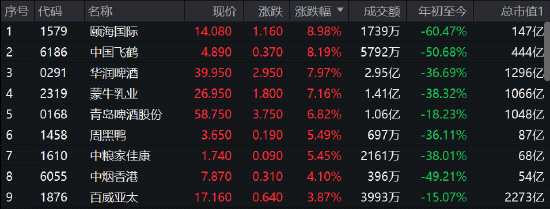 消費(fèi)股集體大漲,頤海國際漲近9%,中國飛鶴漲超8%,華潤啤酒漲8%,蒙牛乳業(yè)、青島啤酒漲7%,周黑鴨、中糧家家康等漲超5%。