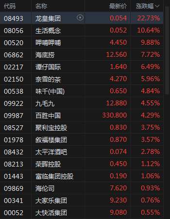 11月1日消息,餐飲股午后拉升,龍皇集團(tuán)漲近23%,呷哺呷哺漲近10%,海底撈漲近8%,奈雪的茶漲近6%,九毛九漲近5%。