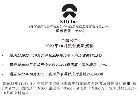 蔚來汽車公告,10月交付量為10059輛,同比增長174.3%;今年累計(jì)交付92,493輛汽車,同比增長32.0%。截至2022年10月31日,蔚來汽車?yán)塾?jì)交付量達(dá)到259,563輛。