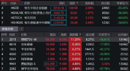 恒生科技指數(shù)漲超2%,理想汽車漲超11%,京東健康漲8%,平安好醫(yī)生、阿里健康漲6%,美團(tuán)漲超4%,騰訊重返230港元。