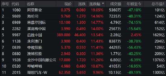 消費股全面爆發(fā),阿里影業(yè)漲超19%,海倫司、思摩爾國際、美高梅中國漲超14%,百勝中國、永利澳門、中教控股、澳博控股漲超11%,呷哺呷哺漲超10%,理想汽車漲10%。