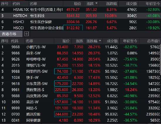 恒生科技指數(shù)暴漲10%,小鵬汽車漲28%,蔚來(lái)、嗶哩嗶哩漲20%,理想、阿里巴巴漲18%,騰訊漲超10%。