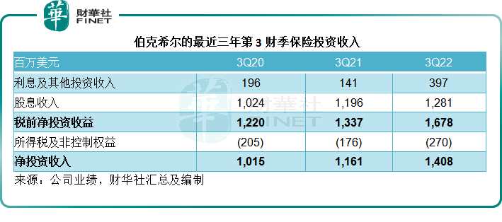 用浮存金投資,所產(chǎn)生能夠“袋袋平安”的股息和利息收益,被伯克希爾確認為“保險投資收入”。2022年第3季,保險投資收入同比增長21.27%,至14.08億美元,抵扣掉保險承銷的虧損,則意味著其保險業(yè)務凈利潤為4.46億美元,同比增長18.3%。