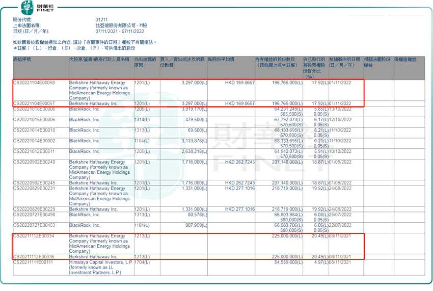 摘要: 港交所的數(shù)據(jù)顯示,11月1日,“股神”巴菲特的投資旗艦伯克希爾(BRK.A.US)進一步減持比亞迪(01211.HK,002594.SZ)。今年下半年以來,港交所權益披露中三次伯克希爾減持比亞迪(00
