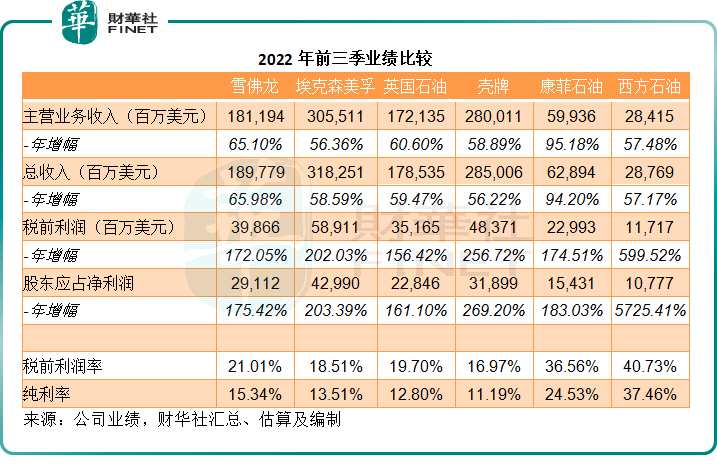 2022年前三季的業(yè)績表現(xiàn)方面,西方石油繼續(xù)完勝。其油氣業(yè)務(wù)凈收入同比增長59.01%,至208.69億美元,總收入同比增長57.17%,至287.69億美元;稅前利潤同比大增近6倍,至117.17億美元;股東應(yīng)占凈利潤同比增57倍,至107.77億美元,純利率由去年同期的1.01%提高至37.46%。