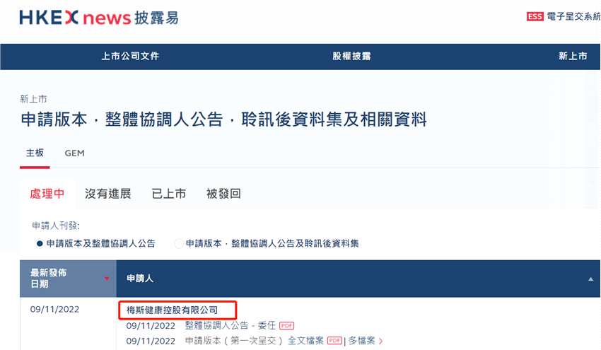 11月10日訊 了解到,中國線上醫(yī)師平臺(tái)梅斯健康第二度遞表赴港上市,據(jù)港交所文件顯示,梅斯健康第一次申請(qǐng)為今年4月29日,即申請(qǐng)已于10月底到期,11月9日再度申請(qǐng)上市,聯(lián)席保薦人為中金及麥格里。