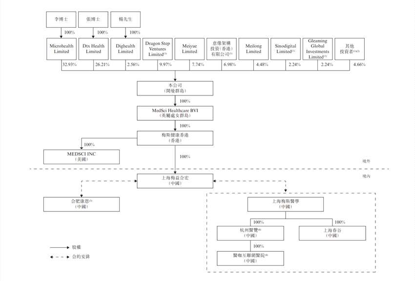 股權(quán)結(jié)構(gòu)上,李博士(張博士的配偶,透過Microhealth Limited)、張博士(李博士的配偶,透過Dtx Health Limited)及(iii)Meilong Limited(由張博士(包括透過Dtx Health Limited持有約2.58%權(quán)益)持有約44.67%的權(quán)益并為張博士的緊密聯(lián)系人)分別持已發(fā)行股份總數(shù)約32.93%、26.21%及4.48%。李博士、張博士、Microhealth Limited、Dtx Health Limited及Meilong Limited合共控制本公司已發(fā)行股份約63.62%,為控股股東。