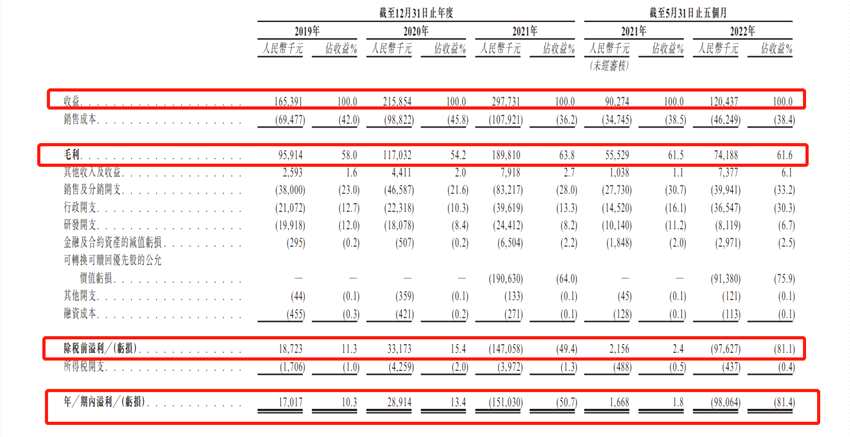 財(cái)務(wù)數(shù)據(jù)方面,招股書顯示,2019年至2021年及2022年前5個(gè)月,梅斯健康營收分別為1.65億元、2.16億元、2.98億元、1.2億元;毛利分別為9591萬元、1.17億元、1.9億元、7418.8萬元;凈利潤分別為1702萬元、2891萬元、-1.51億元及-9806.4萬元,也就是說,2021年及今年前五個(gè)月一共17個(gè)月累計(jì)虧損約2.49億元。