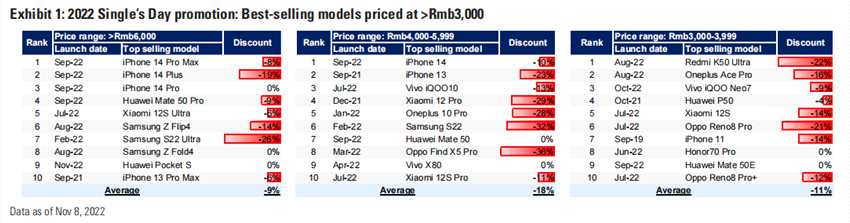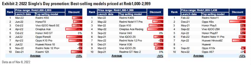 高盛發(fā)研報(bào)指,該行持續(xù)關(guān)注智能手機(jī)的促銷及銷售勢(shì)頭,因其為庫(kù)存消化的重要影響因素。該行主要留意到:1)今年年終促銷活動(dòng)期間的智能手機(jī)折扣高達(dá)36%,與較該行初步調(diào)查中看到的618促銷折扣(高達(dá)41%)相似,反映市場(chǎng)需求的持續(xù)疲軟;2)與之前版本相比,相機(jī)/SoC規(guī)格相似;3)在最暢銷的機(jī)型中(不同定價(jià)段共60款機(jī)型),大部分機(jī)型于2022年上半年以及2022年7月/9月推出,反映了庫(kù)存消化的持續(xù)。