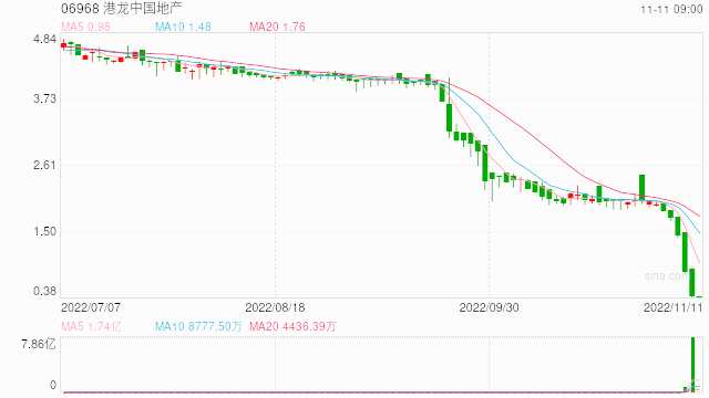 港龍中國(guó)地產(chǎn)近期持續(xù)暴跌,周跌近80%,年跌逾90%,市值只剩6.9億港元,前日跌42%,昨日跌49%。