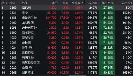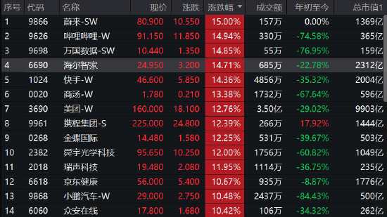 海倫司、李寧、康希諾、龍湖、碧桂園服務(wù)、海爾智家、新城發(fā)展等漲近15%,快手、碧桂園、藥明生物等漲超14%,九毛九、小鵬等均漲超10%。