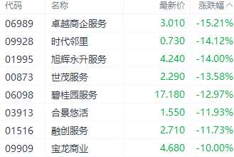 內(nèi)房股多數(shù)下挫,也帶動(dòng)物業(yè)管理股走低,截至收盤,時(shí)代鄰里(09928.HK)、旭輝永升服務(wù)(01995.HK)、世貿(mào)服務(wù)(00873.HK)分別下跌14.12%、14%、13.58%。