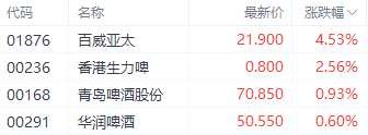 啤酒股中,百威亞太(01876.HK)、香港生力啤(00236.HK)、青島啤酒股份(00168.HK)分別上漲4.53%、2.56%、0.93%。