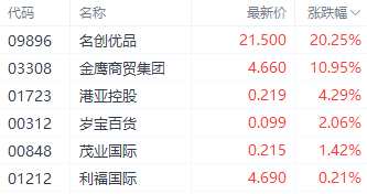 零售股中,名創(chuàng)優(yōu)品(09896.HK)、金鷹商貿(mào)集團(tuán)(03308.HK)、港亞控股(01723.HK)分別上漲20.25%、10.95%、4.29%。