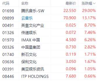 影視娛樂股中,騰訊音樂(01698.HK)、云音樂(09899.HK)、IMAX中國(guó)(01970.HK)分別上漲29%、13.17%、6.26%。