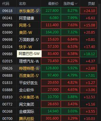 11月18日消息,恒生科技指數(shù)漲幅擴(kuò)大至4%,京東漲8.27%,網(wǎng)易漲7.63%,美團(tuán)漲7.32%,快手漲6.53%,嗶哩嗶哩漲5.92%,百度漲4.79%,小米漲3.88%,騰訊漲3.29%。