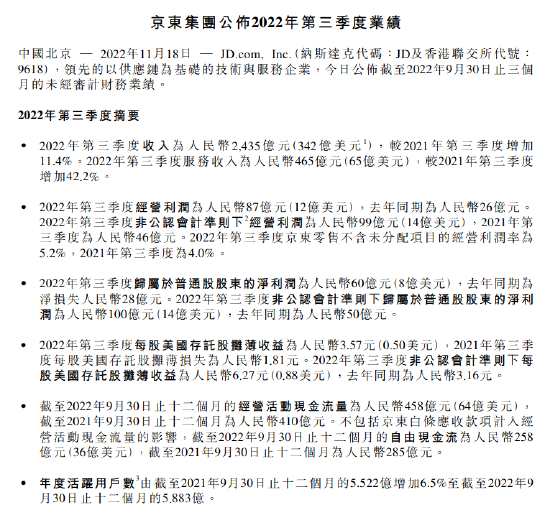京東集團:2022年第三季度歸屬于普通股股東的凈利潤為人民幣60億元(8億美元),去年同期為凈損失人民幣28億元。2022年第三季度非公認會計準則下歸屬于普通股股東的凈利潤為人民幣100億元(14億美元),去年同期為人民幣50億元。