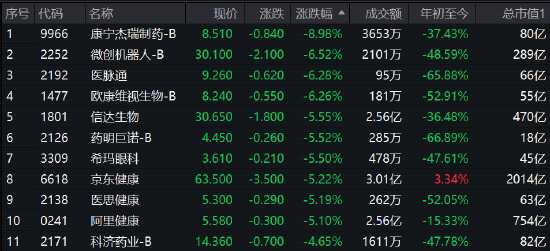 醫(yī)藥股調(diào)整,康寧杰瑞制藥跌近9%,微創(chuàng)機器人、醫(yī)脈通、歐康維視跌超6%