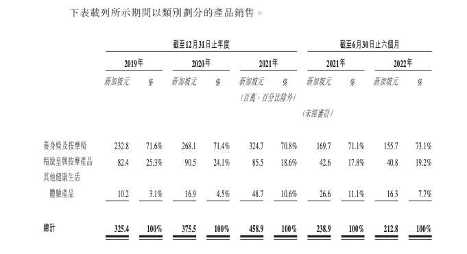 招股書顯示,公司主要提供三類產品,包括養(yǎng)身椅及按摩椅、精致皇牌按摩產品(包括臀腿和足部按摩器、肩頸和背部按摩器及便攜式按摩器)及其他健康生活體驗產品(包括電競按摩椅、室內運動及健康測量儀、空氣凈化器、加濕器、居家凈水器、旅游產品及美容產品)。