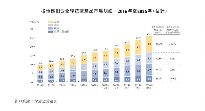 據(jù)灼識咨詢的資料顯示,鑒于消費者的購買力增強及對健康保健意識的提高,全球按摩產品市場已從2016年的96億美元增至2021年的168億美元,預計2022年至2026年將以復合年增長率10.6%進一步增長至2026年或之前的261億美元。