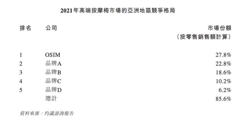 按2021年市場份額計,OSIM在亞洲高端按摩椅市場排名第一,市場份額為27.8%。OSIM與其他四個品牌在亞洲高端按摩椅市場中占2021年總市場份額的85.6%