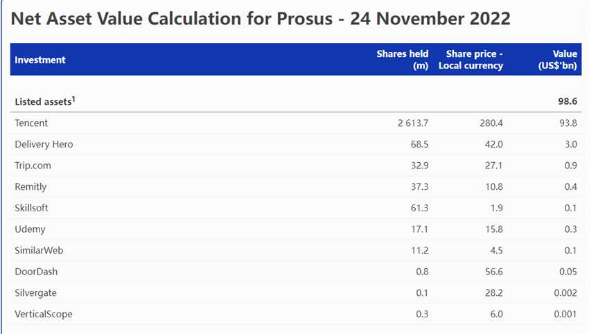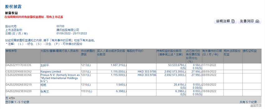 根據(jù)騰訊控股最大股東南非Naspers荷蘭子公司Prosus的資產(chǎn)凈值報(bào)表顯示,截至11月23日持有騰訊控股26.137億股。