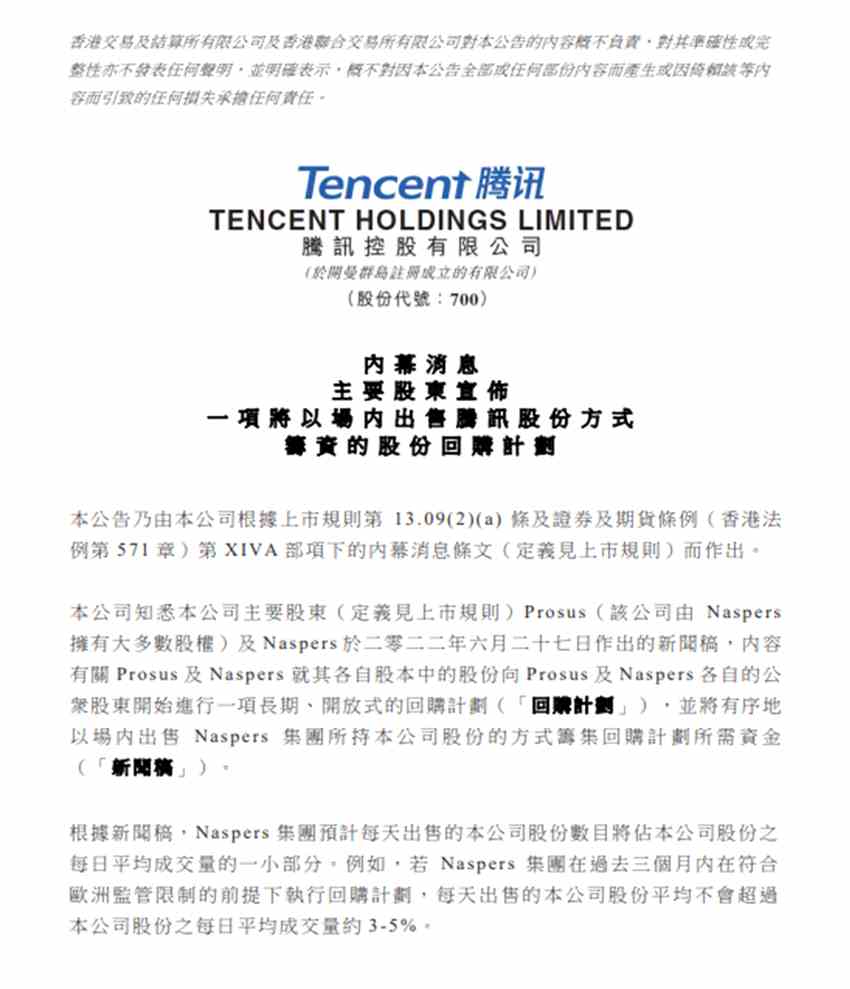 事實(shí)上,市場(chǎng)對(duì)Naspers減持騰訊動(dòng)向尤為關(guān)注,自今年6月以來(lái),Naspers宣布將開啟長(zhǎng)期回購(gòu)計(jì)劃,根據(jù)當(dāng)時(shí)騰訊控股的公告,騰訊主要股東Prosus及Naspers宣布,內(nèi)容有關(guān)Prosus及Naspers就其各自股本中的股份向Prosus及Naspers各自的公眾股東開始進(jìn)行一項(xiàng)長(zhǎng)期、開放式的回購(gòu)計(jì)劃,并將有序地以場(chǎng)內(nèi)出售Naspers集團(tuán)所持騰訊股份的方式籌集回購(gòu)計(jì)劃所需資金。