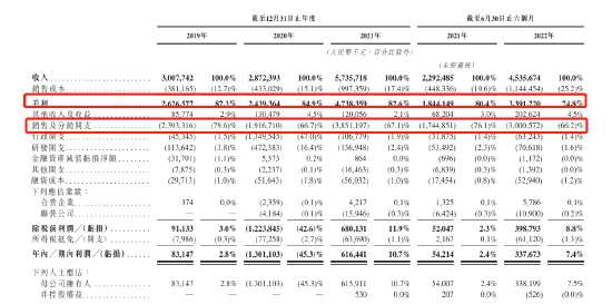 于2019年、2020年 及2021年以及截至2021年及2022年6月30日止六個月,公司銷售費用占收入的比重分別達79.6%、66.7%,67.6%及66.2%。同期,公司凈利潤率僅為2.8%、-45.3%、10.7%及7.5%。