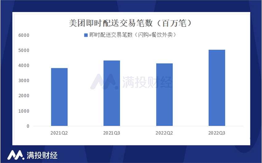 美團即時配送交易數(shù)量的增長是美團三季度財報的一個亮點,即時零售的爆發(fā)讓美團跳出餐飲外賣的范疇,超市、鮮花、酒水飲料、非食品專賣店及寵物護理等品類持續(xù)快速增長,讓美團越來越像一個即時綜合超市。疫情的反復,讓平時難以觸達的超市、賣場等服務由線下轉移到線上,美團包含閃購、美團優(yōu)選、美團買菜等即時零售業(yè)務滿足了疫情下用戶的即時需求,由此帶動即時配送交易筆數(shù)和業(yè)務收入的增長。