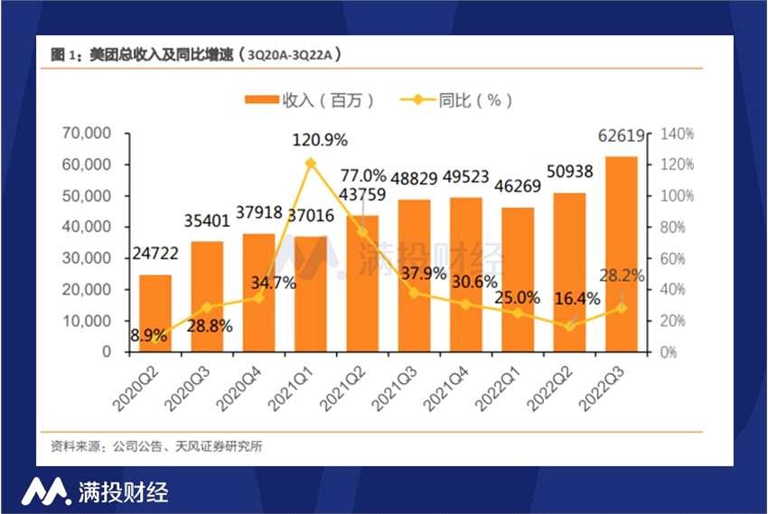 摘要: 11月25日,美團(3690.HK)發(fā)布2022年Q3業(yè)績報告,報告顯示,Q3美團實現(xiàn)營收626億元,較2021年同期的488億元同比增長28.2%;經調整后凈利潤為35.3億元,
