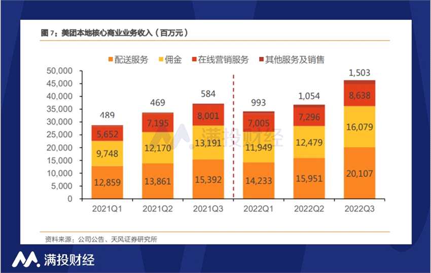 核心本地商務主要包括餐飲外賣、美團閃購、到店/酒店及旅游等業(yè)務。在“本地門店+即時配送”為特征的「即時零售」帶動下,美團即時配送訂單數(shù)量和客單價增長明顯,包括餐飲外賣、美團閃購在內的配送服務、傭金等收入也有明顯增長。三季度美團核心本地商務業(yè)務的配送服務收入為201億元,同比大增30.6%,傭金收入為160億元,同比增長21.9%;但部分收入被疫情下到店、酒店及旅游業(yè)務的交易金額減少所抵消。