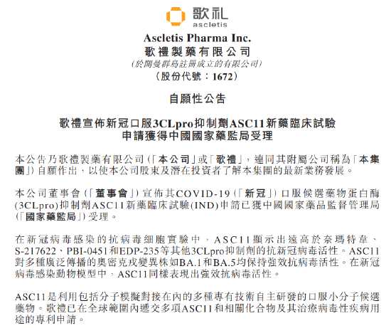 歌禮制藥-B在港交所公告,COVID-19(新冠)口服候選藥物蛋白酶(3CLpro)抑制劑ASC11新藥臨床試驗(yàn)(IND)申請已獲中國國家藥監(jiān)局受理。