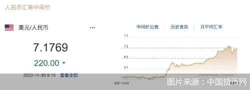 (記者 廖蒙)11月30日,央行授權(quán)中國外匯交易中心公布,2022年11月30日銀行間外匯市場人民幣匯率中間價(jià)為:1美元對人民幣7.1769元,前一交易日中間價(jià)報(bào)7.1989元,單日調(diào)升220基點(diǎn)。